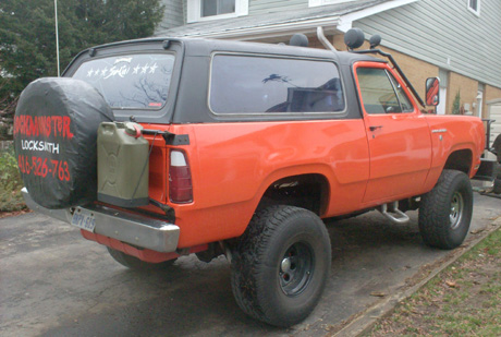 1975 Dodge RamCharger. I have the hard top as well as the factory soft top for my RamCharger. I've done a 4 Inch body lift and a 2 Inch suspension lift on it. I will soon be adding more suspension lift. I made a custom light bar for it because nobody makes any aftermarket parts for the RamCharger. I also made the front bumper. I've also replaced the front and rear axles with a set from a 81 RamCharger that I had laying around, so I could have locking hubs to go with the transfer case from a 93 pickup. This way It can be a part time 4 wheel drive and one day I'll replace the axles with a set of Dana 60's when I can afford it. On the back I've got a tire carrier that I also managed to fit a spare gas can on. There's still a lot I would like to do to my truck but as you all know it takes two things, lots of money and lots of time. I know I will never be done, but that's the fun.